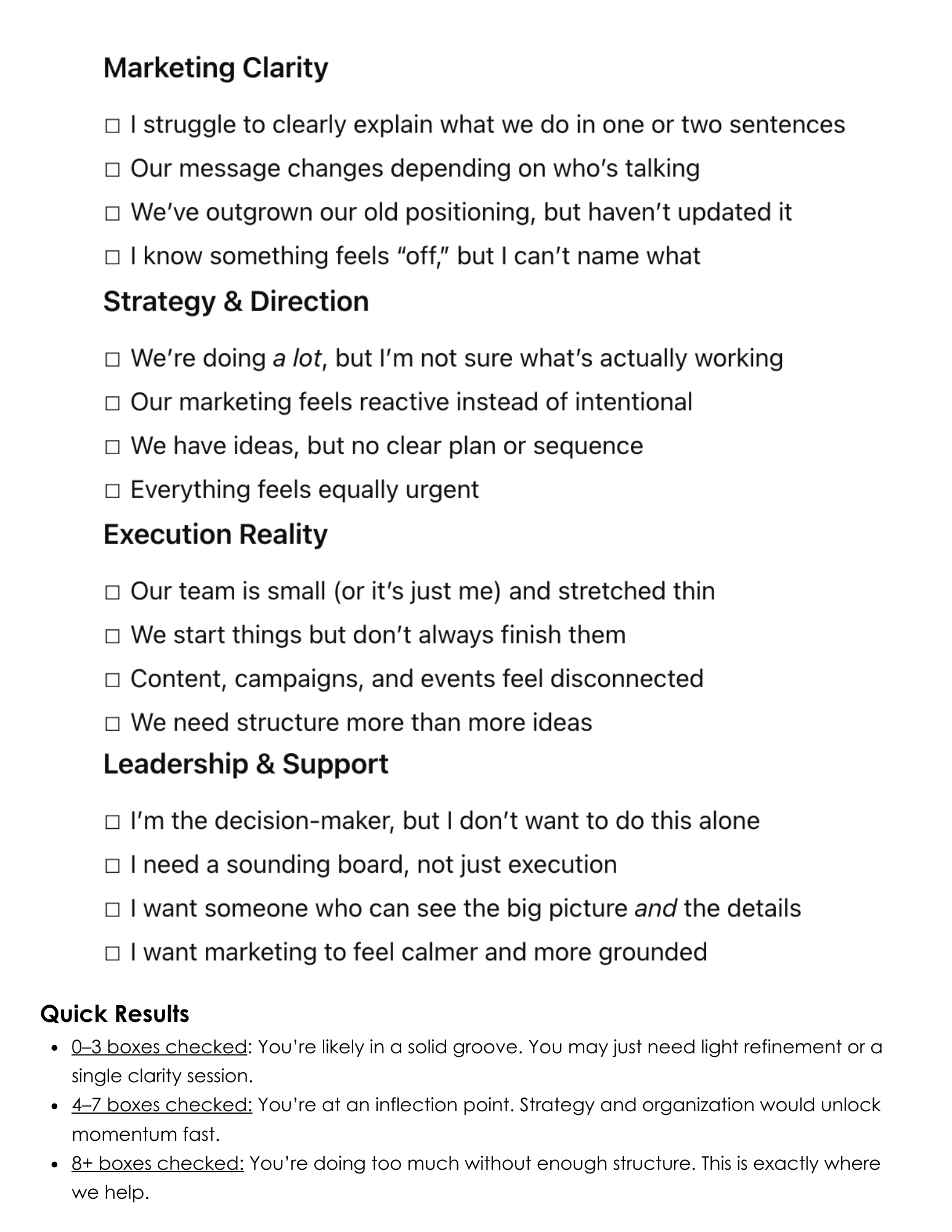 Think of us as your fractional CMO brain—helping you slow things down just enough to move forward with confidence and intention.dicated to building with purpose and clarity. Collaboration and curiosity drive everything we do. Our process is simple, thoughtful, and designed with your experience in mind. We believe great results come from clear steps, open collaboration, and a shared sense of purpose.